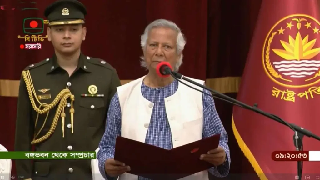 অন্তর্বর্তীকালীন সরকারের সরকারের প্রধান উপদেষ্টা হিসেবে শপথ নিলেন ড. মুহাম্মদ ইউনূস। বঙ্গভবনের দরবার হলে তাঁকে শপথ বাক্য পাঠ করান রাষ্ট্রপতি মো. সাহাবুদ্দিন।